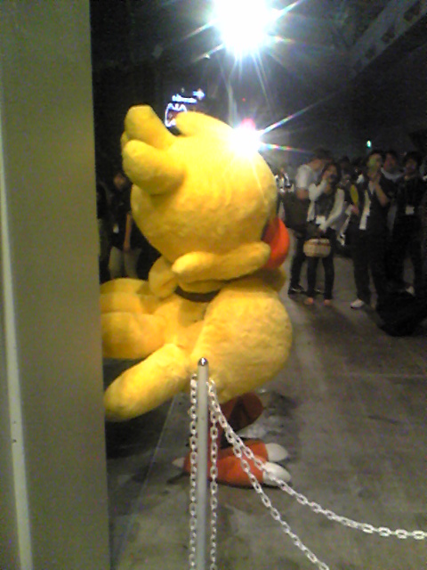 右邊這張圖片是我正在排隊等著要填寫問券拿莫古里杖的時候,旁邊突然出現的FF系列吉祥物「陸行鳥」。有人問我未啥他不出去逛逛,出去逛的話等等工作人員就累死,因為可能回不去了。因為一定會被群眾包圍,就跟前幾年TGS出現KERORO的情況一樣。