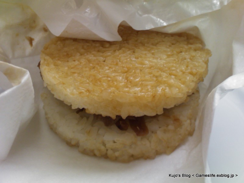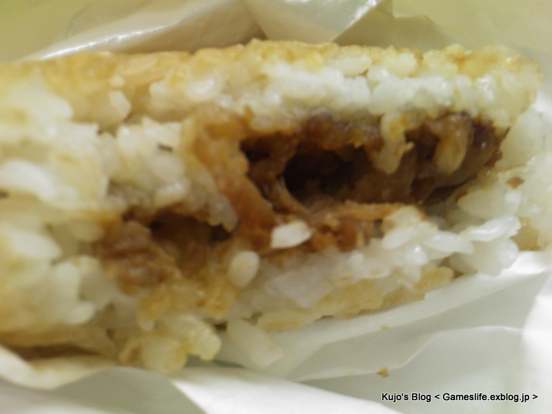 包裝上的部分是有特別說肉量增加20%,不過這張照片看起來似乎沒什麼肉,等等看另外一張比較清楚。整體的形狀看起來很不錯,聞起來也很香,標準的薑燒豬肉,沒有菜的原因可能是不能放太久吧,總之跟謠傳的與摩斯一樣算是破解了。因為很燙的緣故,花了一點時間才咬下第一口。