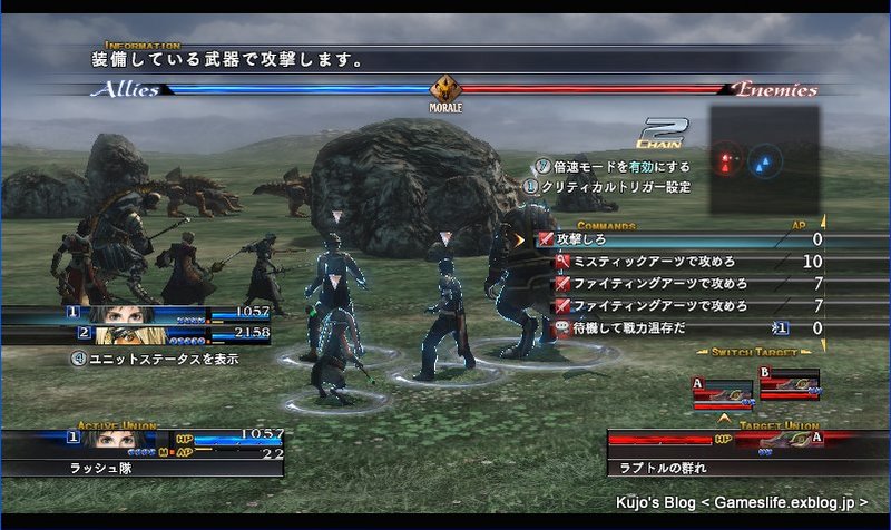 這款主要的特色在於戰鬥的系統蠻特殊的,除了以小隊為單位編成之外,攻擊目標的安排、戰術、陣型等都很有趣,畫面演出也令人滿意。除了傳統的指令式戰鬥之外,在過程中還會不定時的出現即時按鈕要你輸入,時間抓的剛好的話就會大幅增加攻擊力,防禦的時候按的好可以準確的防下敵人的攻擊。因為我還沒有玩很多,等多玩一些在來繼續報告,中間可能會有進度日記之類的吧~