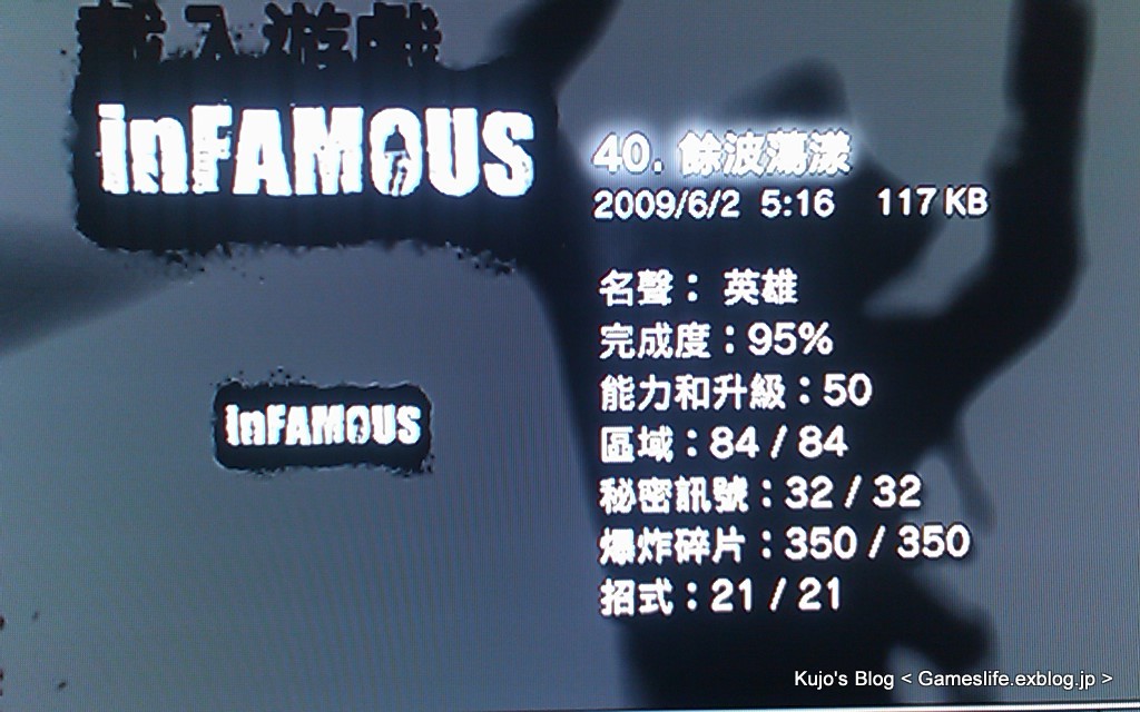 這是紀錄檔的照片,紀錄檔會顯示目前的遊戲進行狀況。我破關的時候破片總共才319個,破關之後整個巡過一次增加到347,接著就卡死了...怎麼找都沒找到。後來進行地毯式的區塊搜索,湊到349個,最後一個一直找不到。幾個小時之後想說先去解"三人同時高空落下"的特技,沒想到運氣不錯,在距離岸邊有一段距離的木樁上面,發現了最後一個破片,真是令人萬分感動啊。