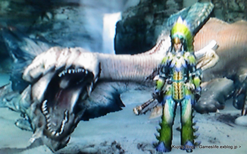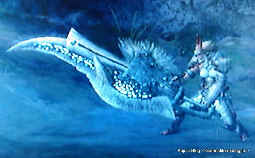 後來換了除了鞋子整套冰牙龍的裝,優勢是湊出迴避+2跟跑者。鞋子不採用同系列的原因是因為太醜了....搭一個火龍足比較好看且補強一下火防禦的部分。冰牙龍打起還來蠻煩的,且我沒有火屬性武器斧動作又比較慢,初期打起來還蠻吃力的。後來很懶惰的用麻痺斧弄麻之後送在他嘴邊送兩個大炸COMBO...這套總防禦力已經破150了,HR30之前可能都不會再換了吧。