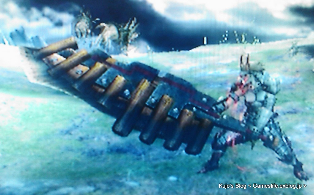 海龍武器的特色就是寶藍色(廢話),然後武器屬性帶電,瓶的部分是強屬性瓶。說到瓶大家可能有點耳熟,因為那是弓專用的道具。現在MH3把四個消失的武器全部弄在一個斧頭裡面。怎麼說咧,斧頭有弓的瓶、GUNLANCE的龍擊炮、狩獵笛的來回攻擊、雙刀的系統切換以及STAM消費攻擊。