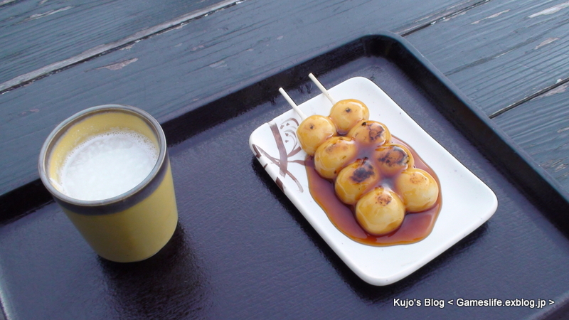 鐺鐺~ 甘酒與道中團子。說來慚愧,在日本住了幾年媽的一次團子都沒吃過,當然先入為主的覺得他是什麼好吃的東西啦...這次吃了之後還是沒改變我對他的看法(笑)。倒是甘酒的味道讓我流連忘返,喝起來根本就是甜酒釀,熱熱的喝真的很舒服,一邊看著湖跟山,吹著有點涼的風,還蠻享受的。不過冷掉之後就會甜的有點噁心所以要熱熱的解決他。也許這能解釋甘酒為何都會配個沾醬油膏的團子一起吃吧?w